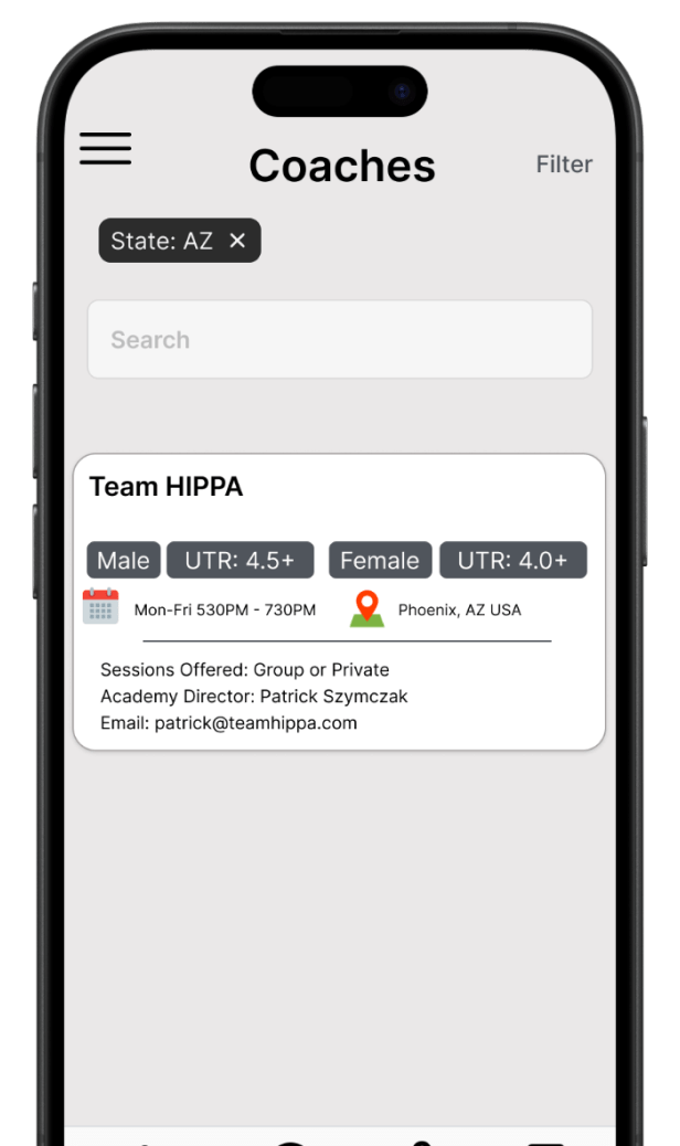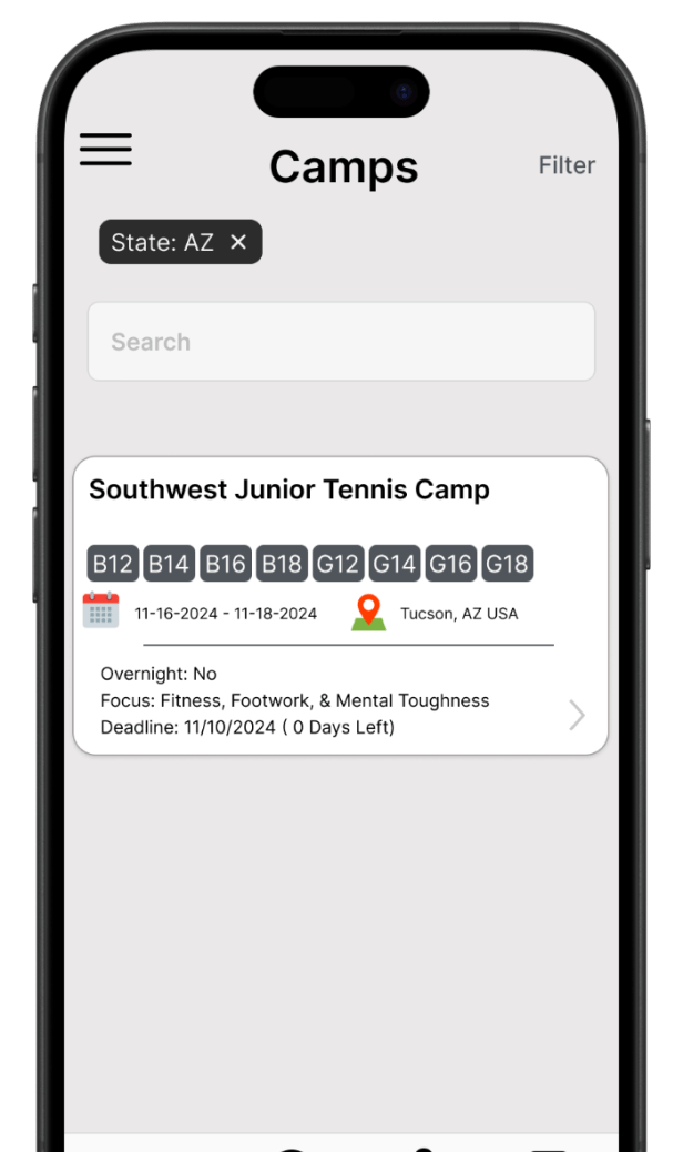 Discover and filter tennis camps by date, location, gender, age group, and skill focus. Stay informed with updates and schedules.
